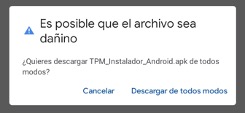 2. Al seleccionar la opción “descargar Android” saldrá un aviso como el siguiente, en el cual debe seleccionar “Instalar de todos modos”